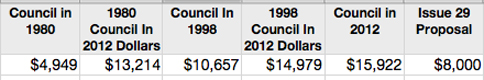 Former Mayors Chuck Horn and Dick Harman are both endorsing Issues 28 and 29, and I checked to see what both mayors were earning the last year they served as mayor — then I used InflationData.com to calculate what each of their salaries would be in 2012 dollars. I found that the $23,500 that Mayor Patterson earns each year exceeds the inflation rate from 1980 and 1998 — but the amount decreed by Issue 29 would cut the mayor’s salary considerably below the inflation rate, particularly compared to 1998 dollars. This pattern also was true for the pay given to council members in 1980 and 1998 — when compared to 2012 dollars.
