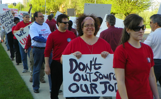 On the eve of resuming contract negotiations, 50, or more, members of The Dayton Newspaper Guild yesterday marched in front of the Dayton Daily News building, 1611 South Main St. The Guild is protesting that the owner of DDN, Cox Media, is outsourcing jobs and is eliminating seniority rights.