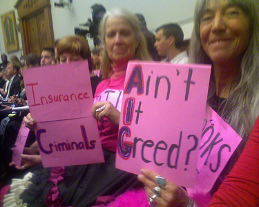 Interesting article in Salon, March Madness on Capitol Hill, by Mike Madden, tells how the chair of a House Committee investigating AIG, Paul Kanjorski, angrily scolded the “Pink Ladies” who were holding signs in protest. This is the first I’ve noticed the Pink Ladies, though they’ve been around now since the start of the Iraq War. The “Pink Ladies,” from a group called CODEPINK, are in the news because of their protest at the AIG hearing.
