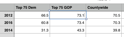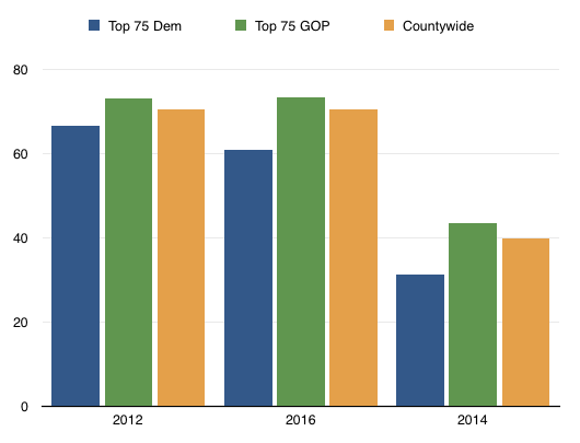 For the top 75 Dem precincts the decrease from 2012 to 2014 was 53.0%.