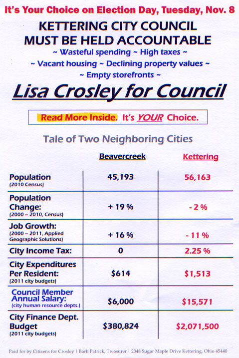 Today, I received a great campaign piece from Mrs. Crosley — a three color large envelop with printing outside (reproduced below). Inside contained a three color letter written on both sides. In her letter — see PDF of one side here — Mrs. Crosley makes specific proposals to revitalize Kettering. Her eighth point states, “By implementing the above proposals, we will lower the cost of government, create new jobs, and stabilize our population. This will allow a gradual and responsible reduction in our City income tax from 2.25% to 1.5% — while maintaining excellent essential public services.”