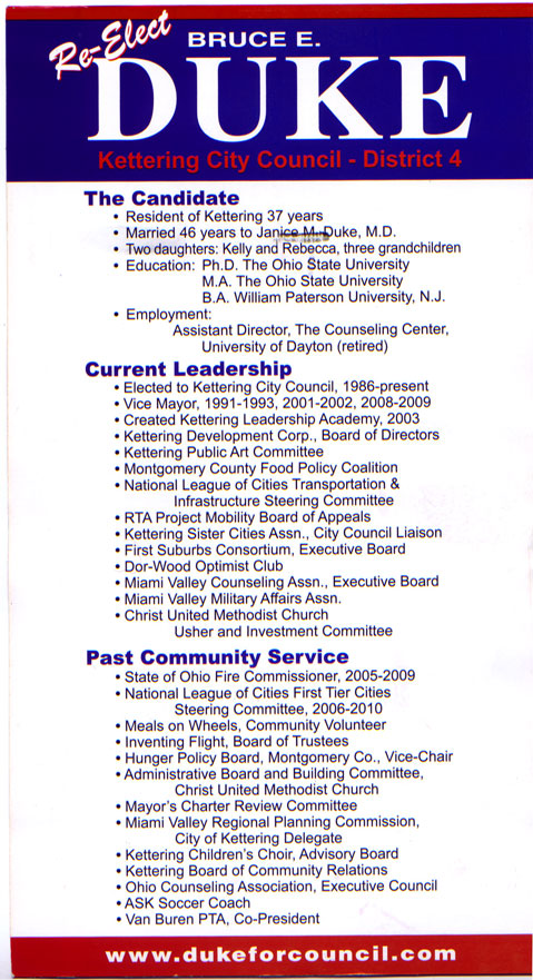 Mr. Duke’s web-site shows that is has the support of The Mayor of Kettering, Don Patterson; The Vice Mayor of Kettering, Tony Klepacz; Councilwoman, Amy Schrimpf; Former Congressman, Tony Hall; and the Kettering Professional Firefighters, IAFF 2150.