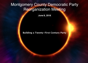 In the business meeting for the Montgomery County Democratic Party this evening, I’d like to see the formation of a committee that is charged with establishing a long-term plan for the vitalization of our local party organization. I’d like to see the coming Reorganization Meeting approve a six year plan — call it “Project 2024” — so that the culmination of the plan aligns with the Montgomery County’s total eclipse on April 8, 2024.