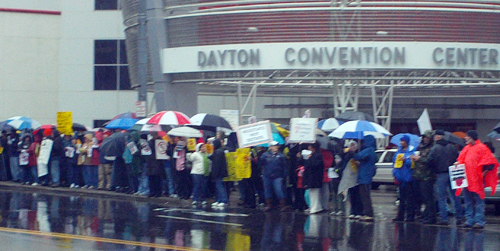 A big crowd -- at least 1000 -- chanted "Kill the Bill" at the Dayton Convention Center. Senator Peggy Lehner met with a group of teachers inside of the Center.
