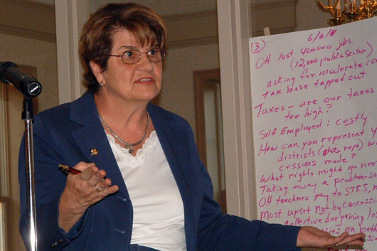 Senator Peggy Lehner defended SB-5 and said it was legislation that responded to public unions pushing the rights of public workers too far. She said, “At one time public employees were paid less than their civilian counterparts, but not so anymore.” She zeroed in on health and retirement benefits for public employees as being, “way out of line.” Lehrner, who chairs the Ohio Senate’s Committee on Education, put most of her focus on teachers. She said, “We can’t afford to give 15 sick days per year to teachers,” and explained that these days accumulated until cashed in at retirement. Lehner said “step raises” of 3% or so, when added to contract raises of 2% or 3%, meant teachers were receiving annual increases totaling 5% or 6% — much more than most civilian workers receive.