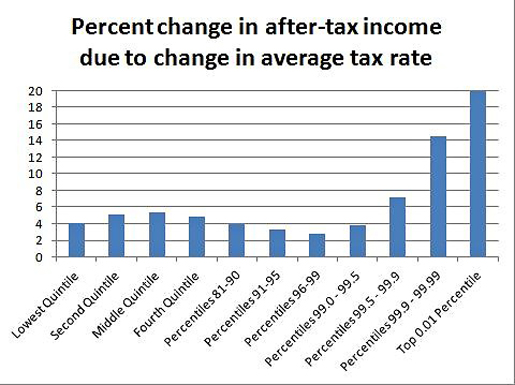 Paul Krugman prepared this chart from data from the Congressional Budget Office — that only goes to 2005, but shows a trend that today would be even more dramatic — that shows that changes in tax laws have greatly favored the wealthy. Because of changes in tax laws, an average income may have an increase of 4% in after tax income, but the very wealthy have a 20% increase.