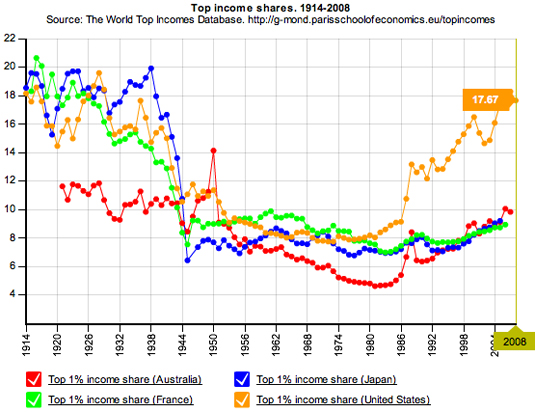 Not only have tax changes favored the wealthy, but the income of the wealthy continues to rise. This is an interesting chart copied from a web-site that studies the distribution of wealth world wide: