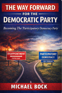 My GPT prompt: Create a book cover for a nonfiction political book titled, “The Way Forward For The Democratic Party: Becoming The Participatory Democracy Party” by Michael Bock, featuring an image of a fork in the road showing that continuance on the current path will lead to disappointment and disaster.