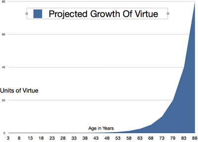 I prepared this graph as an encouragement. Based on the wishful idea that under ideal conditions the growth of virtue can be exponential, if I assume that John’s virtue doubles every five years, I can figure if John has 2.5 units of virtue at age 63, then he had only .02 (two hundredths) units of virtue at age 28, .01 at age 23, etc. The good news is, if my estimate is correct, because of the power of exponential growth, by age 88, John will have over 80 units of virtue. Wow. When I last checked only 75 units of virtue are needed for sainthood.