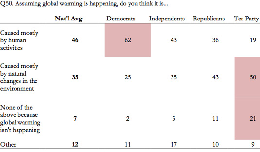 While 62 percent of Democrats say that global warming is caused mostly by human activities, most Tea Party members say it is either naturally caused (50%) or isn’t happening at all (21%).