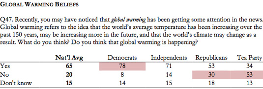 A Yale University study, “Politics and Global Warming,” published earlier this year, based on in-depth interviews with 809 people shows a big division among political groups: “Majorities of Democrats (78%), Independents (71%) and Republicans (53%) believe that global warming is happening. By contrast, only 34 percent of Tea Party members believe global warming is happening, while 53 percent say it is not happening.”