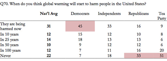 Nearly half of Democrats (45%) say that global warming is already harming people in the United States, while 33 percent of Republicans and 51 percent of Tea Party members say it will never harm people in the United States.
